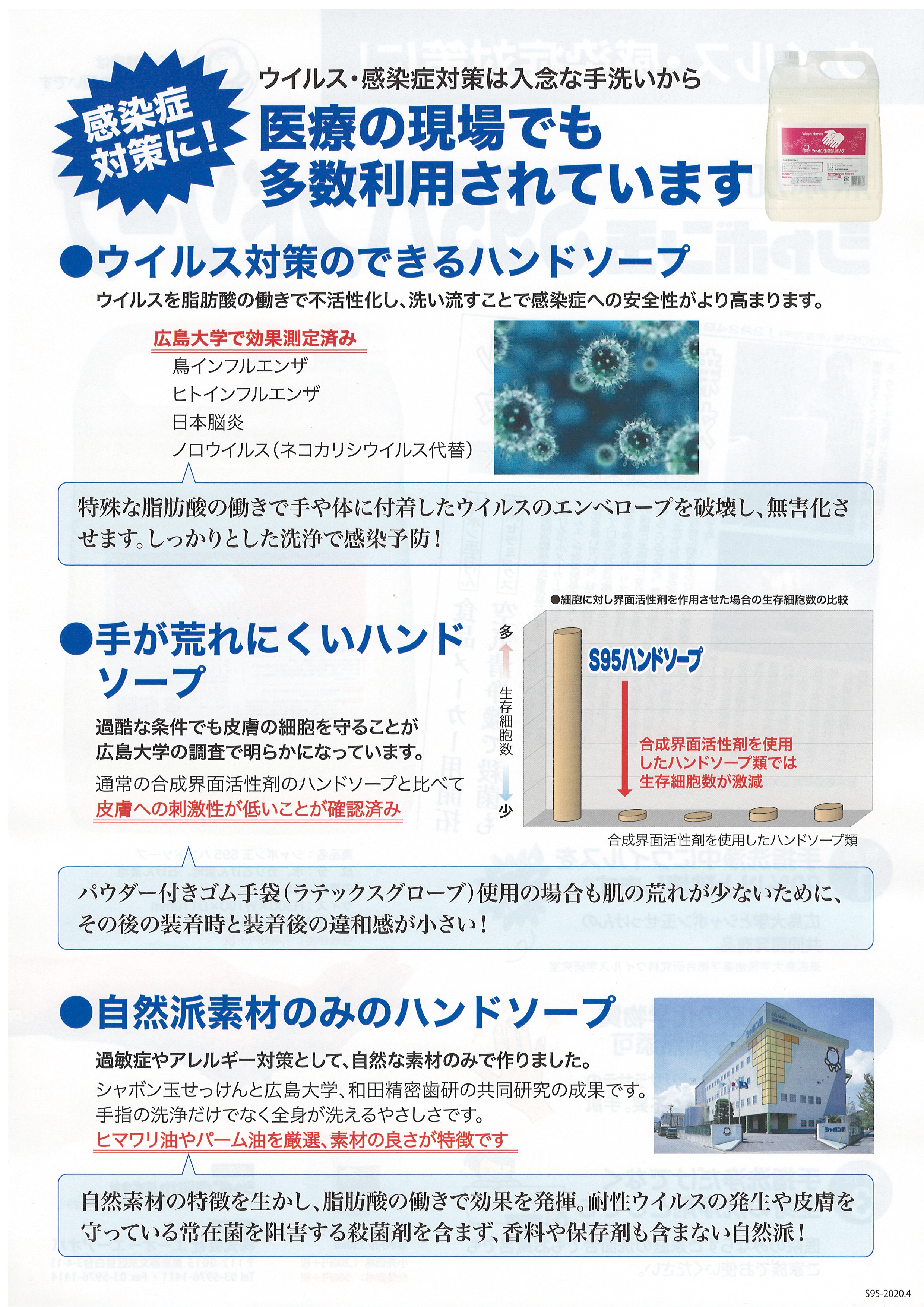 石けんの「洗浄力」は主成分の界面活性剤によるが、インフルエンザウイルスによる実験で、ハンドソープ製品の大半の主成分である合成系界面活性剤と比べ、自然素材無添加石けんの界面活性剤のインフルエンザウイルス破壊能力が、100〜1000倍も大きいことが明らかになった。そして、その攻撃力の差がウイルスに対する石けんの作用の常識を覆す事実がわかった。